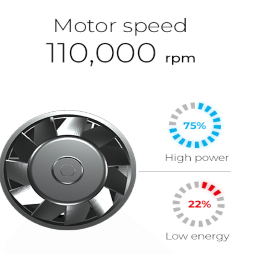 - Energy efficient with enhanced performance, the long-life digital brushless motor operates at 110,000 rpm generating extreme air pressure with low energy consumption